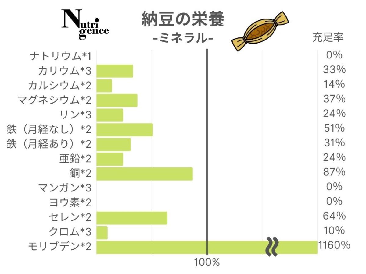 納豆100g食べた場合に20代女性が1日に必要な各栄養素をどの程度摂取できるかを示した割合。