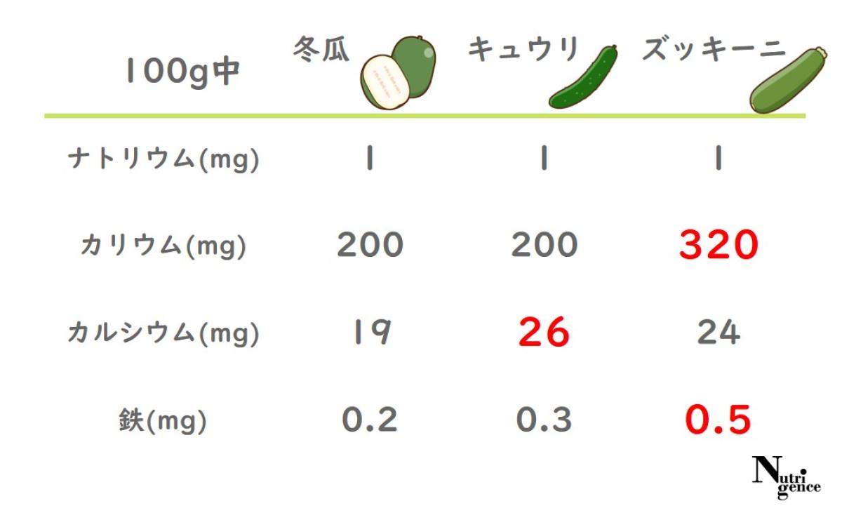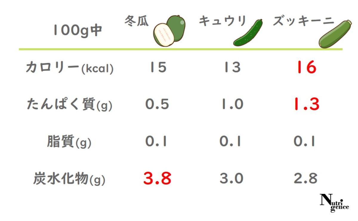 カロリーやたんぱく質は冬瓜やキュウリよりもズッキーニの方が若干多いようです。