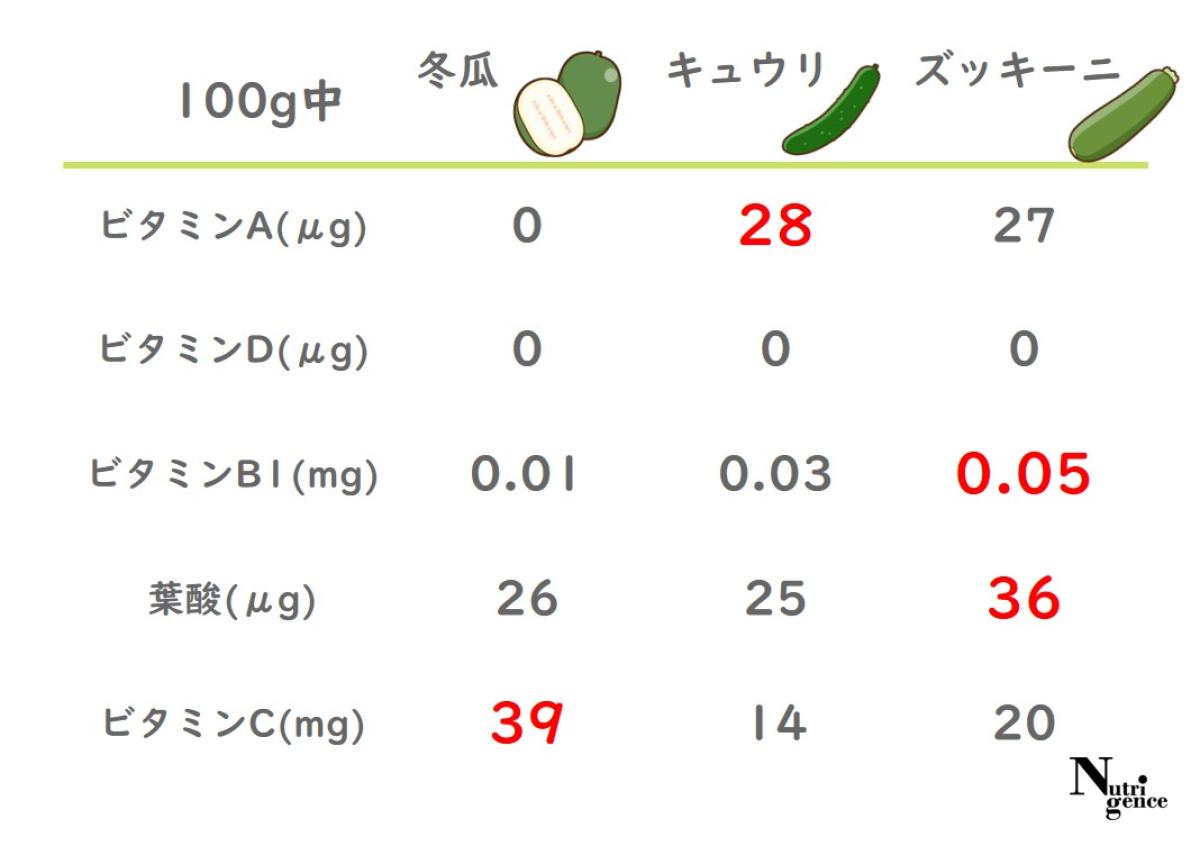 ビタミンA(粘膜や皮膚を保つ役割や視覚を維持する働きを持つ)は、冬瓜やズッキーニよりもキュウリの方が多いようです。