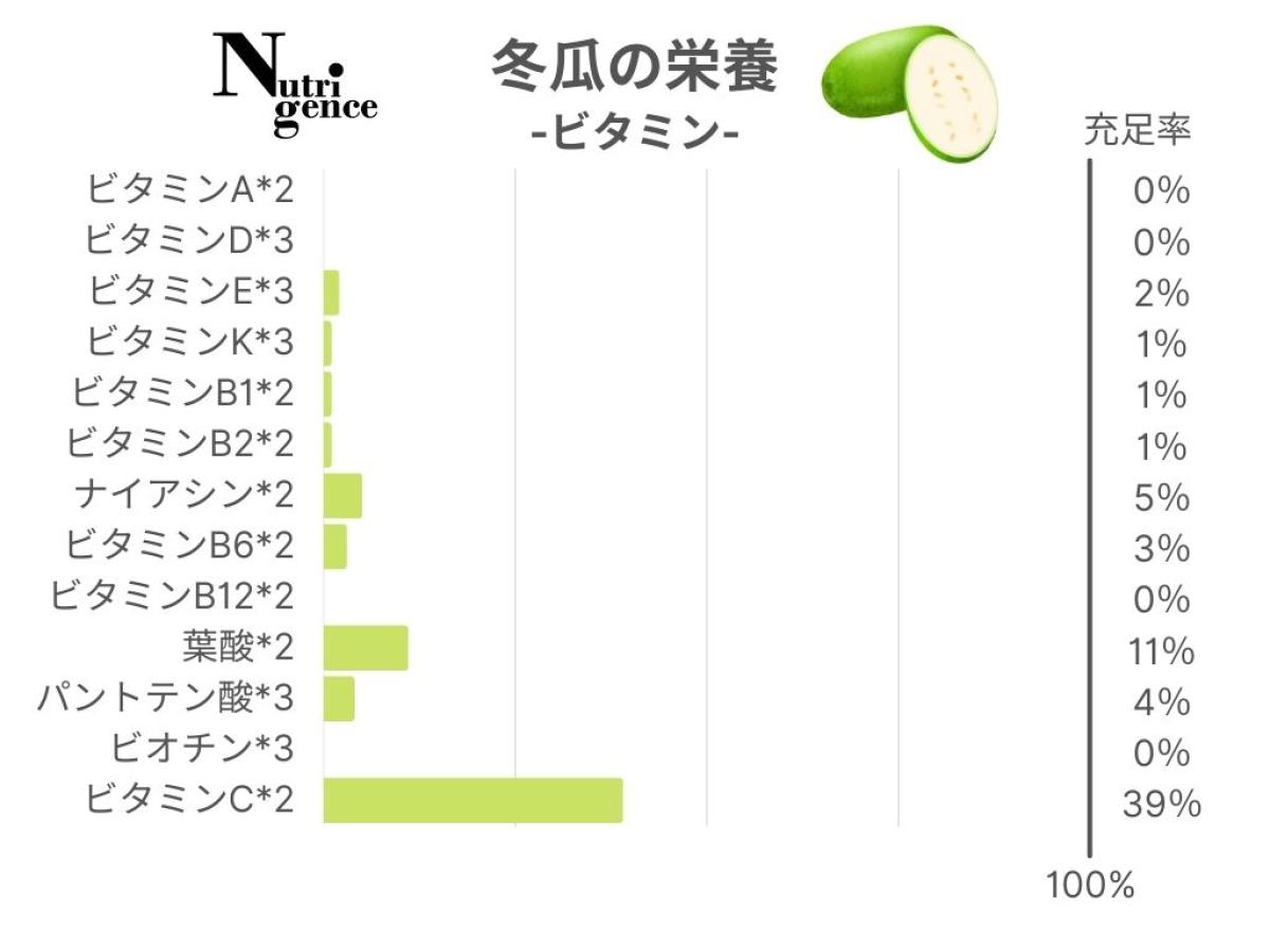 そこで20代女性が冬瓜100gを食べた場合に1日に必要なビタミンやミネラルをどのぐらい摂取できるのかまとめてみました。