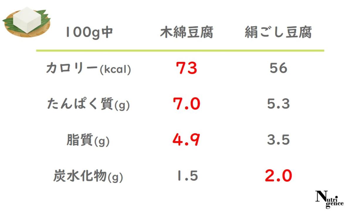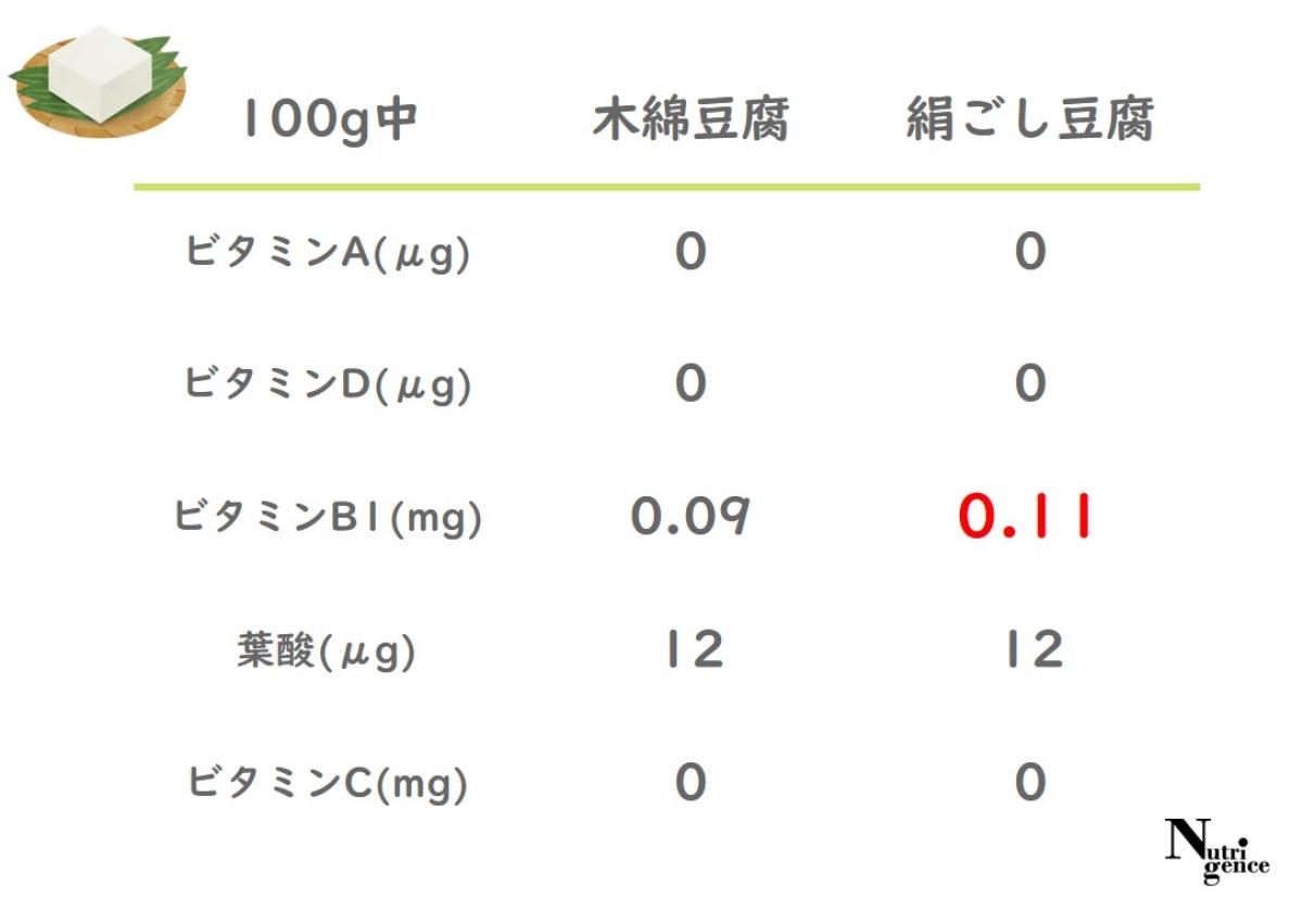 ビタミンB1(糖質をエネルギーに変換させる働きがある)は、絹ごし豆腐の方が木綿豆腐よりも若干多く含んでいるようです。