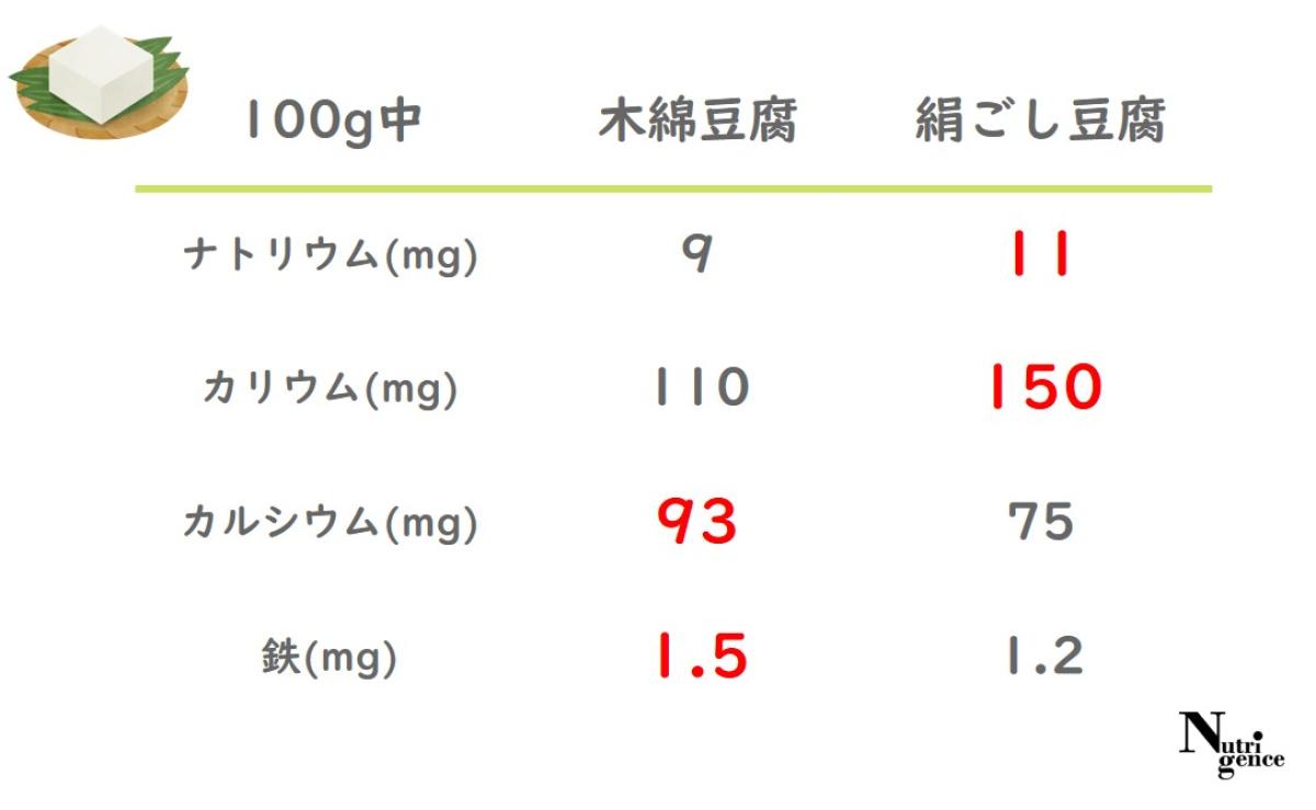 ナトリウム(体内の水分量を調節する働きがある)やカリウム(体水分量を調節する役割や筋肉を収縮させる働きを持つ)は、絹ごし豆腐の方が木綿豆腐よりも若干多く含んでいるようです。