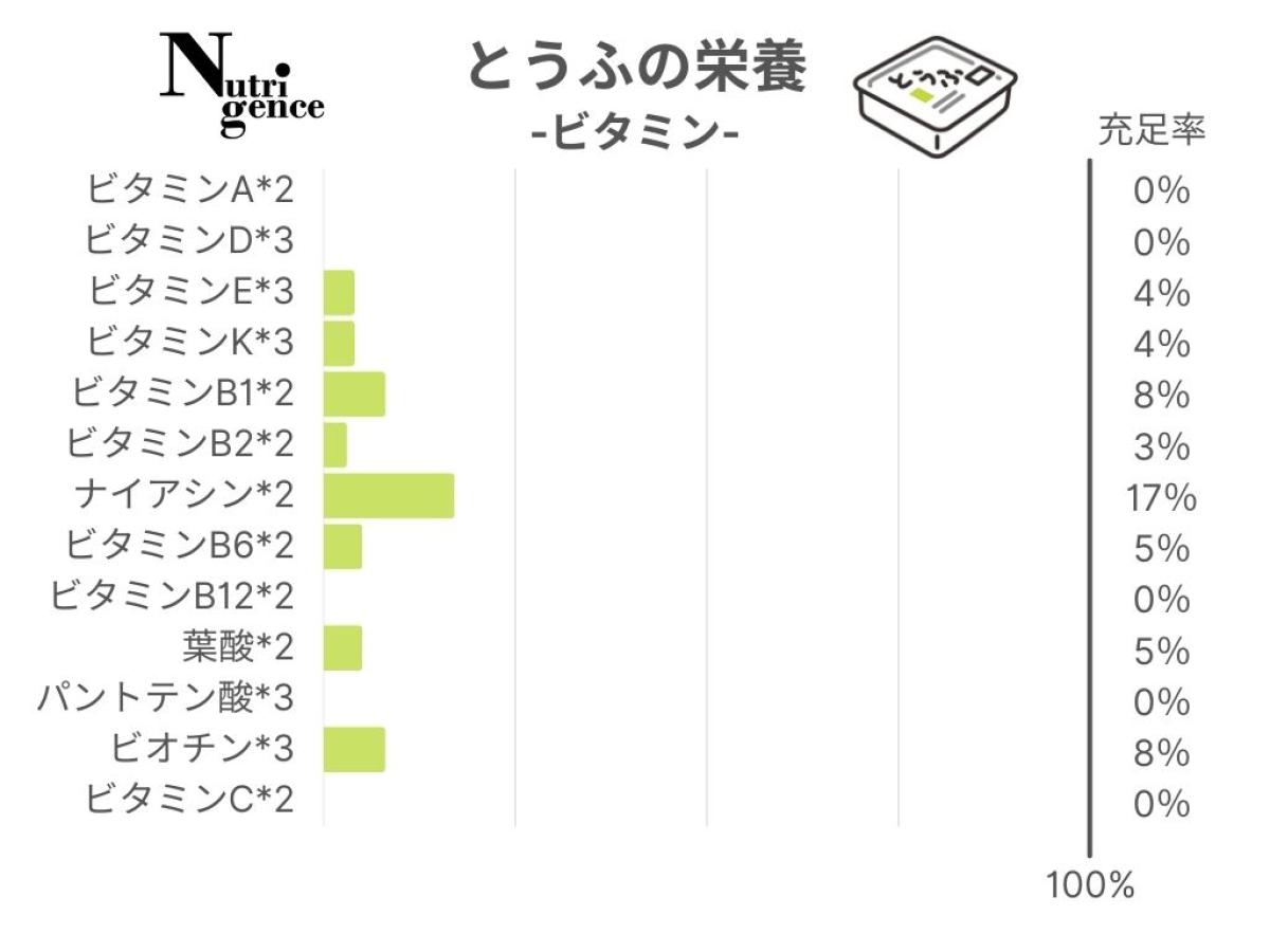 そこで20代女性が木綿豆腐100gを食べた場合に1日に必要なビタミンやミネラルをどのぐらい摂取できるのかまとめてみました。