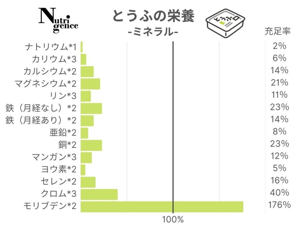 木綿豆腐100g食べた場合に20代女性が1日に必要な各栄養素をどの程度摂取できるかを示した割合。