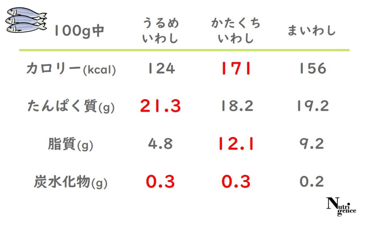 一方、たんぱく質はかたくちいわしやまいわしよりもうるめいわしの方が若干多いようです。