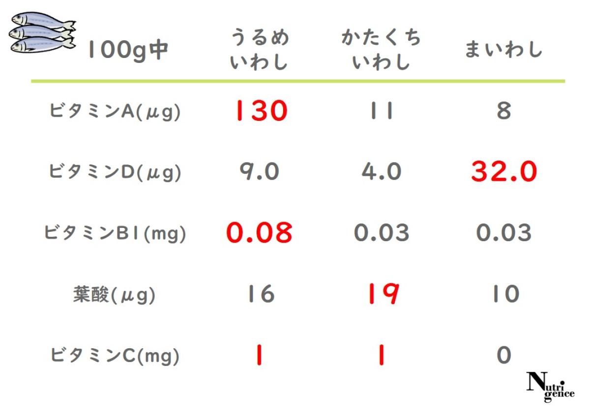一方、ビタミンD(カルシウムの吸収を助ける働きがある)は、うるめいわしやかたくちいわしよりもまいわしの方が多いようです。