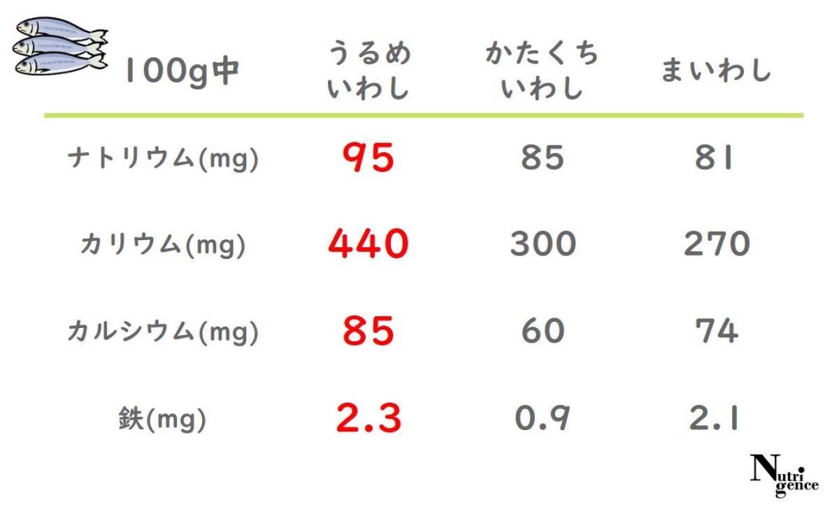 ナトリウム(体内の水分量を調節する働きがある)やカリウム(体水分量を調節する役割や筋肉を収縮させる働きを持つ)、カルシウム(骨や歯の材料という役割や筋肉の動きを保つ働きがある)、鉄(赤血球の材料という役割を持つ)は、かたくちいわしやまいわしよりもうるめいわしの方が多いようです。
