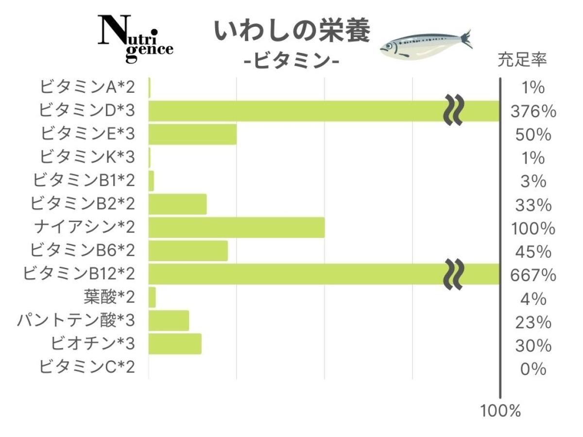 またイワシはビタミンD(カルシウムの吸収を助ける働きがある)やビタミンB12(赤血球を作る働きがある)を豊富に含んでいる食品です。