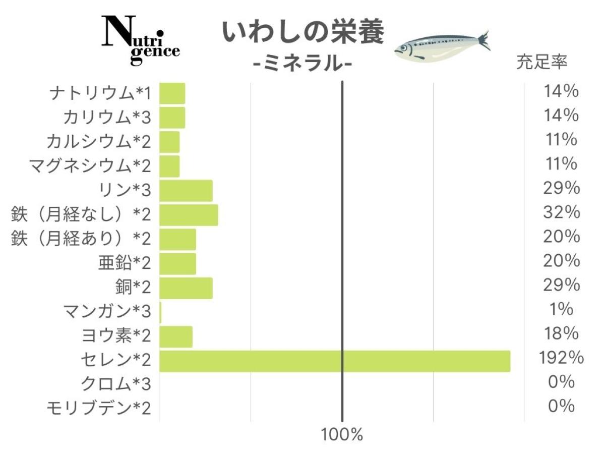 そこで20代女性がまいわし100gを食べた場合に1日に必要なビタミンやミネラルをどのぐらい摂取できるのかまとめてみました。