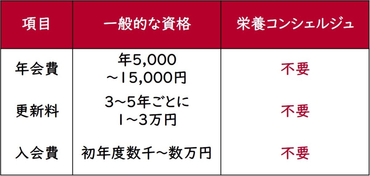 栄養コンシェルジュ資格には、年会費・更新費・入会費が一切かかりません。