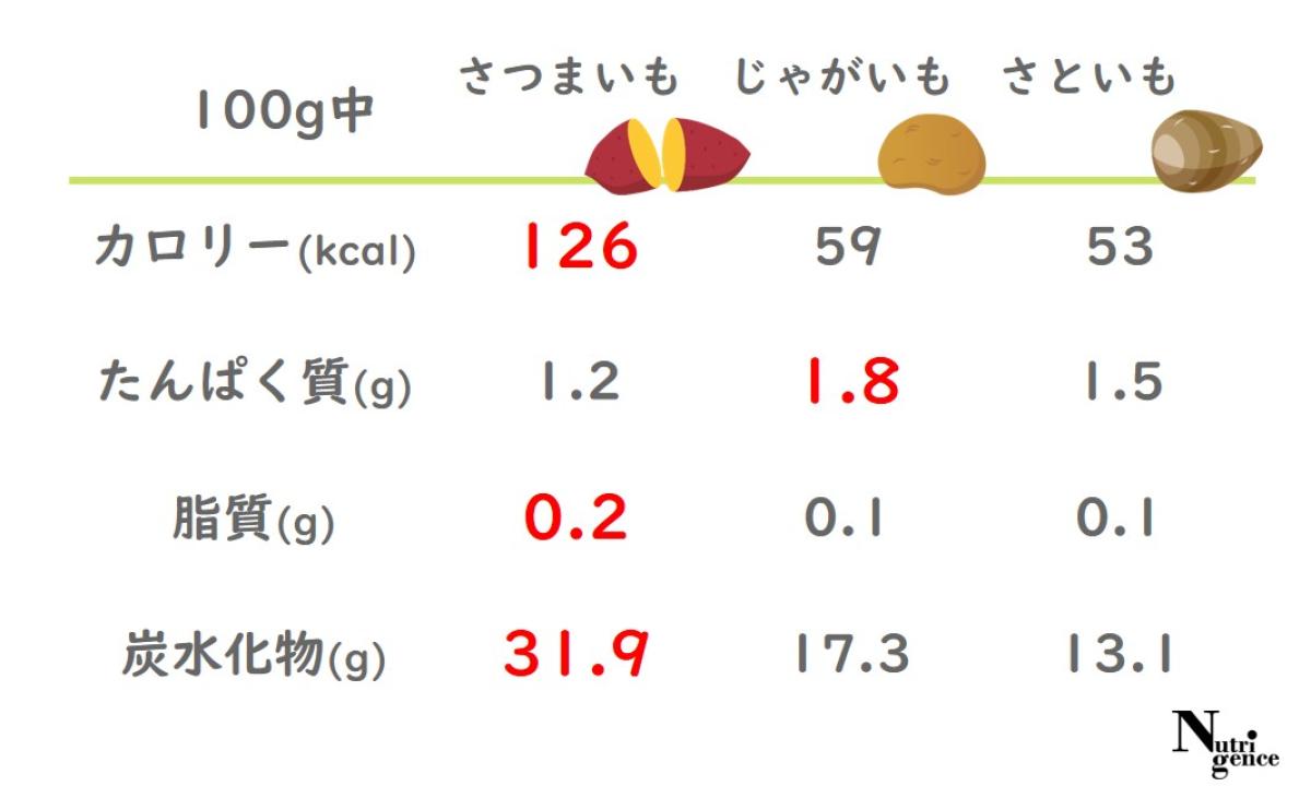 そこで、さつまいもやじゃがいも、さといもでは栄養価にどのような違いがあるのか調べてみました。(可食部100gで比較)
