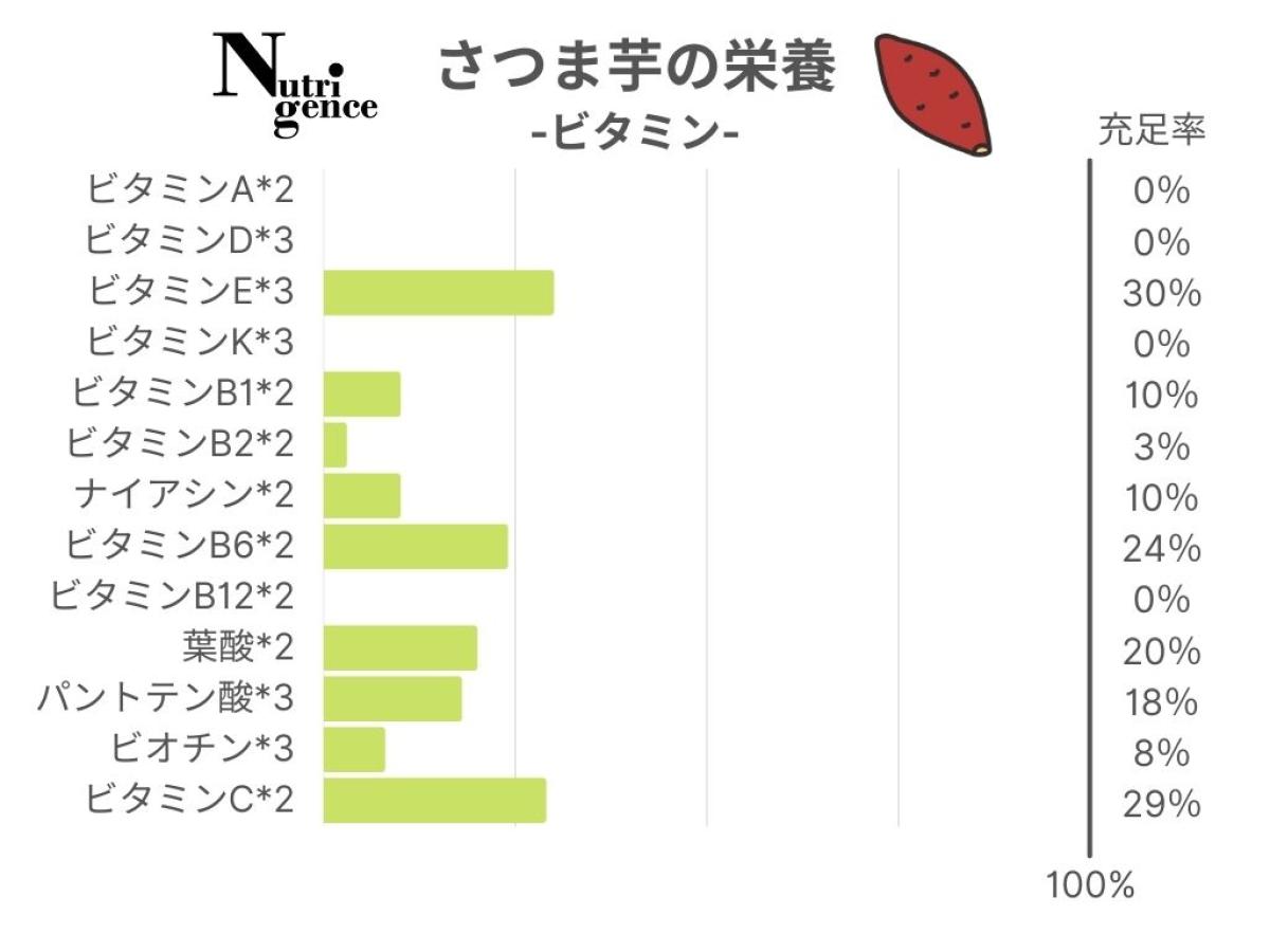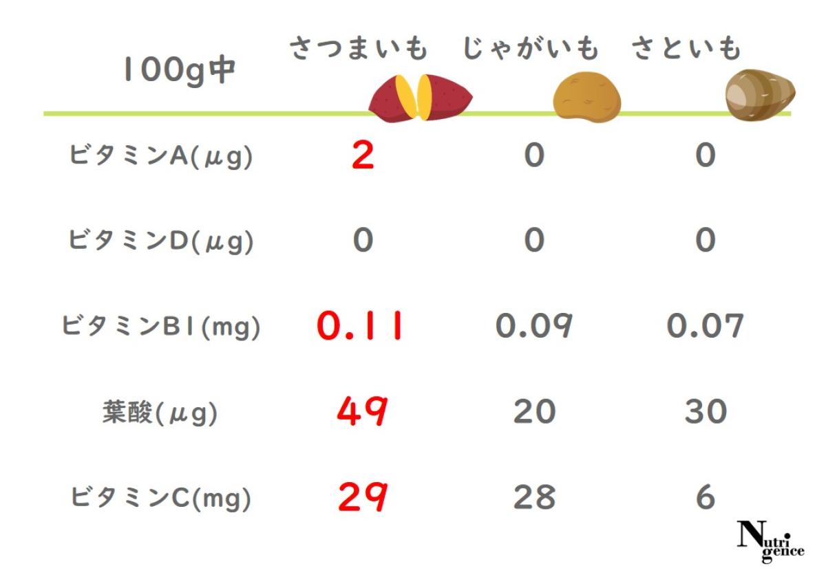 ビタミンA(粘膜や皮膚を保つ役割や視覚を維持する働きを持つ)やビタミンB1(糖質をエネルギーに変換させる働きがある)、葉酸(DNAや赤血球を作る働きを持つ)、ビタミンC(活性酸素から守る役割やコラーゲン合成を助ける働きがある)は、じゃが芋や里芋よりもさつま芋の方が多いようです。