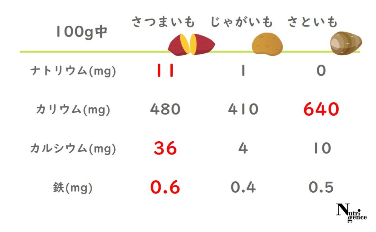 ナトリウム(体内の水分量を調節する働きがある)やカルシウム(骨や歯の材料という役割や筋肉の動きを保つ働きがある)、鉄(赤血球の材料という役割を持つ)は、じゃが芋や里芋よりもさつま芋の方が多いようです。