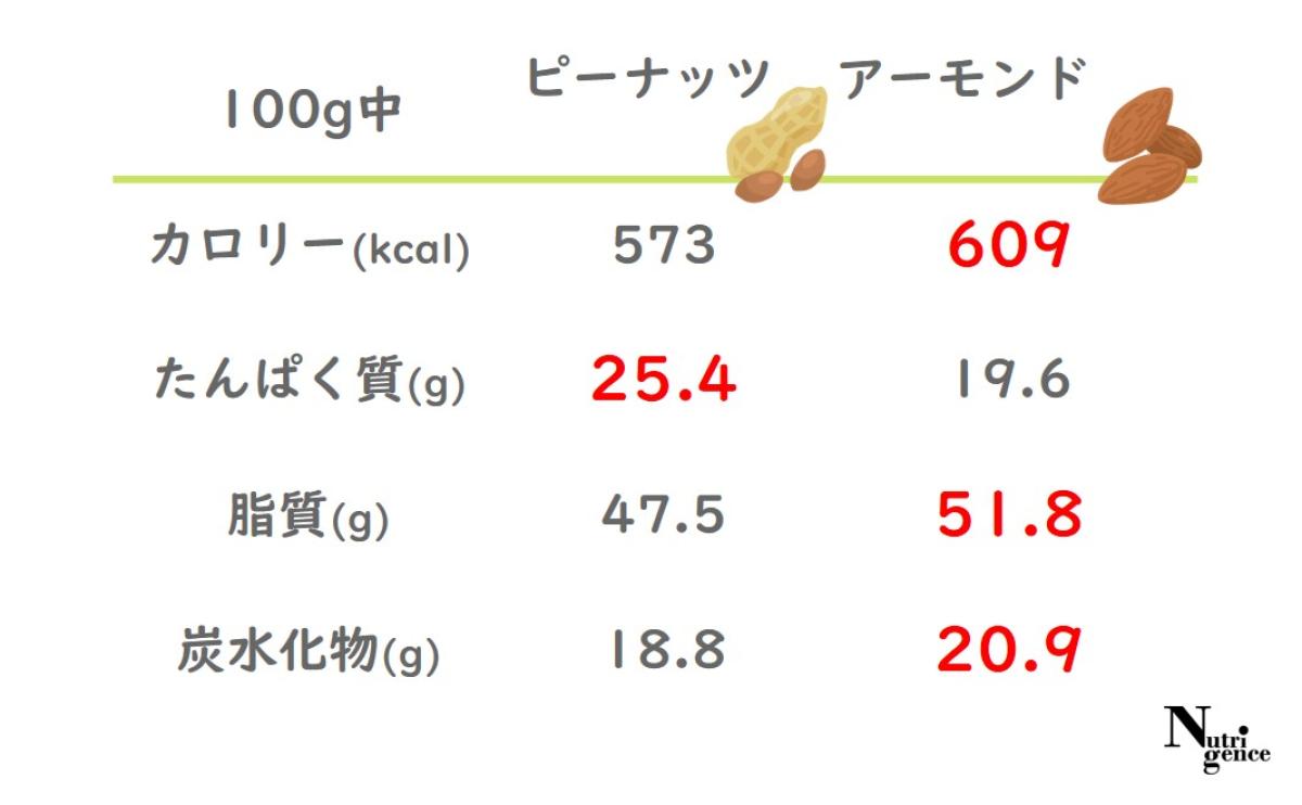 たんぱく質は、ピーナッツの方がアーモンドよりも多く含んでいるようです。