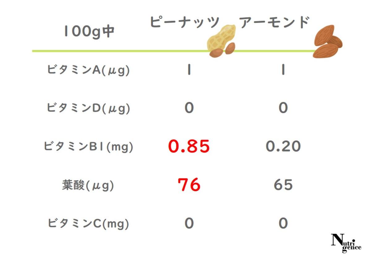 ビタミンB1(糖質をエネルギーに変換させる働きがある)や葉酸(DNAや赤血球を作る働きを持つ)は、ピーナッツの方がアーモンドよりも多く含んでいるようです。