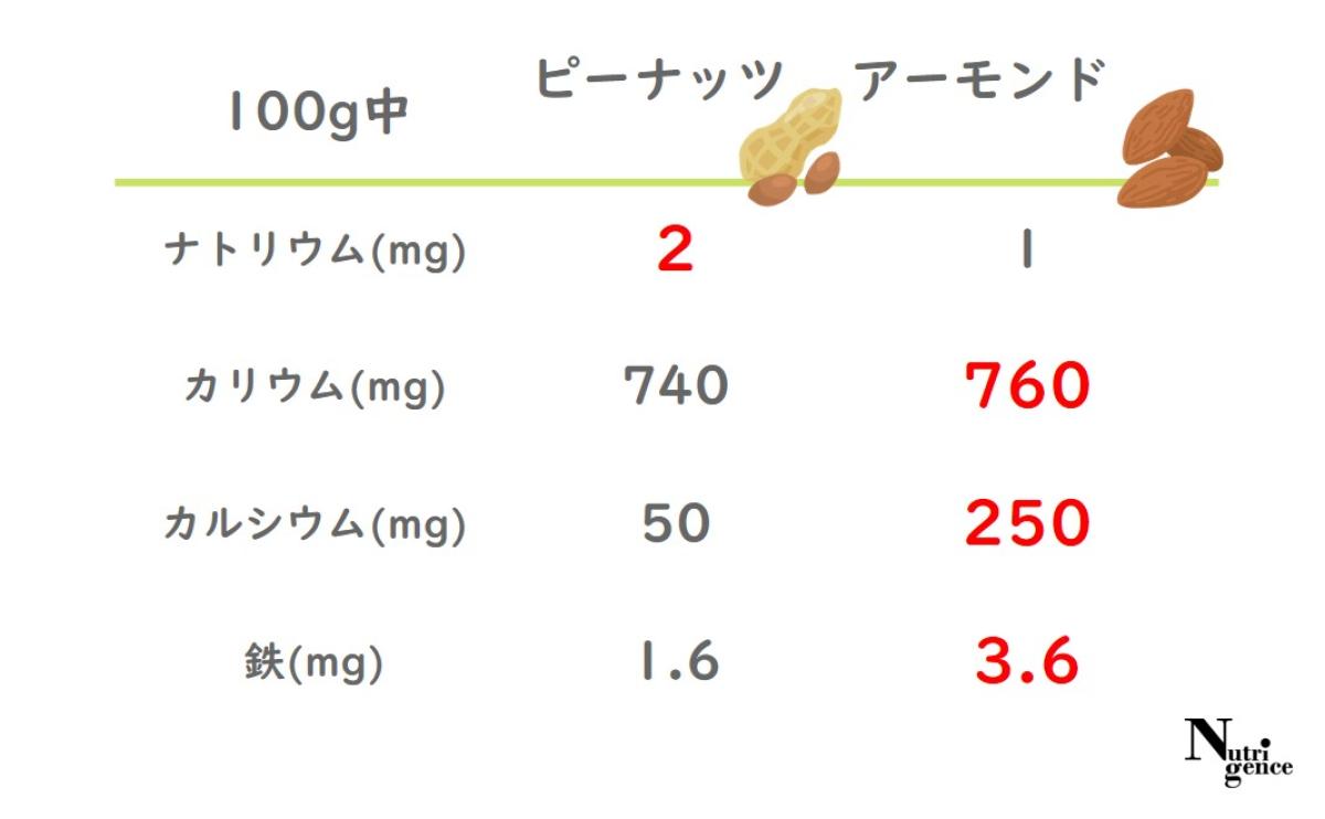 ナトリウム(体内の水分量を調節する働きがある)は、ピーナッツの方がアーモンドよりもわずかに多く含んでいるようです。