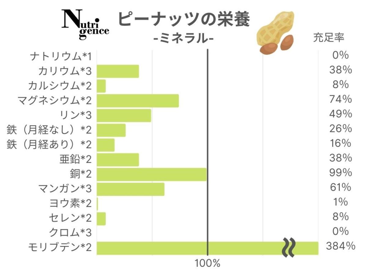 一方、カリウム(体水分量を調節する役割や筋肉を収縮させる働きを持つ)やカルシウム(骨や歯の材料という役割や筋肉の動きを保つ働きがある)、鉄(赤血球の材料という役割を持つ)は、アーモンドの方がピーナッツよりも多く含んでいるようです。