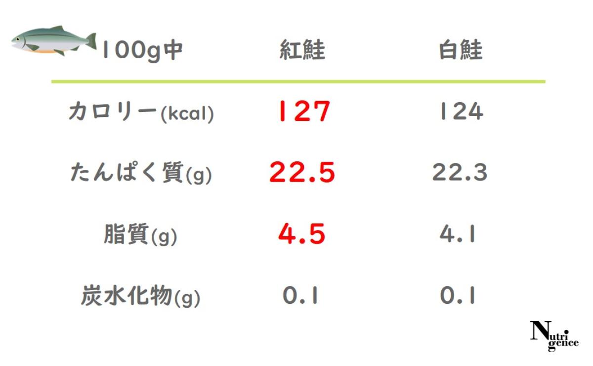 紅鮭と白鮭では栄養価にどのような違いがあるのか調べてみました。(可食部100gで比較)