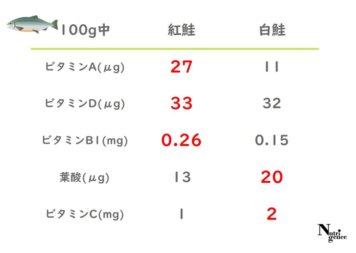 ビタミンA(粘膜や皮膚を保つ役割や視覚を維持する働きを持つ)やビタミンD(カルシウムの吸収を助ける働きがある)、ビタミンB1(糖質をエネルギーに変換させる働きがある)は、紅鮭の方が白鮭よりも若干多く含んでいるようです。