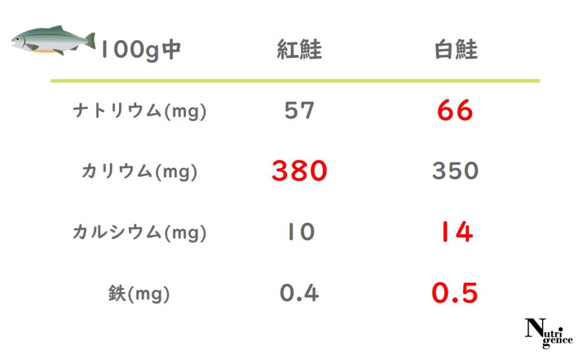 カリウム(体水分量を調節する役割や筋肉を収縮させる働きを持つ)は、紅鮭の方が白鮭よりも若干多く含んでいるようです。