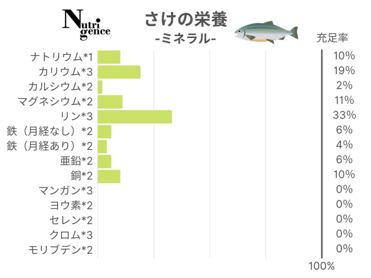 そして、ナトリウム(体内の水分量を調節する働きがある)やカルシウム(骨や歯の材料という役割や筋肉の動きを保つ働きがある)、鉄(赤血球の材料という役割を持つ)は、白鮭の方が紅鮭よりもわずかに多く含んでいるようです。