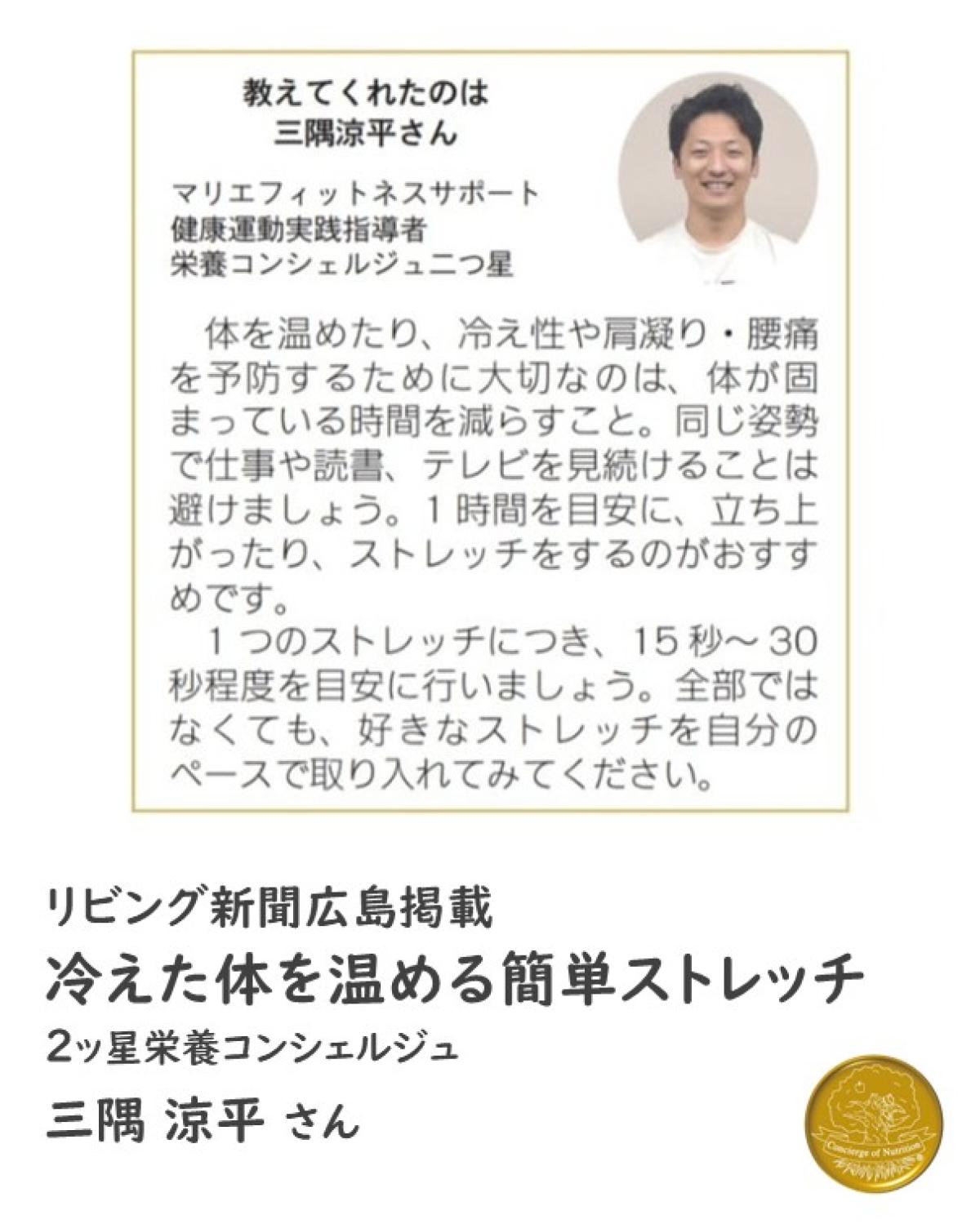 2ッ星栄養コンシェルジュ®である三隅涼平さんがリビング新聞 広島にて冷え切った身体をほぐす簡単ストレッチを紹介しています!
