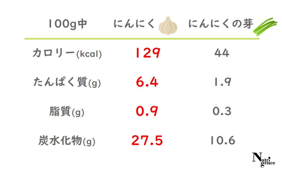 上記の根拠となる、にんにくとにんにくの芽のカロリー・三大栄養素(たんぱく質・脂質・炭水化物)の含有量を比較した表がこちらです。