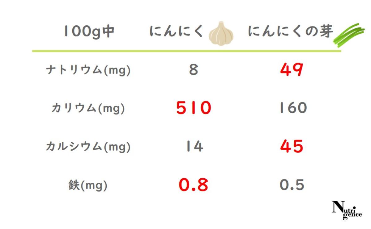 カリウム(体水分量を調節する役割や筋肉を収縮させる働きを持つ)や鉄(赤血球の材料という役割を持つ)はにんにくの方がにんにくの芽よりも多いようです。
