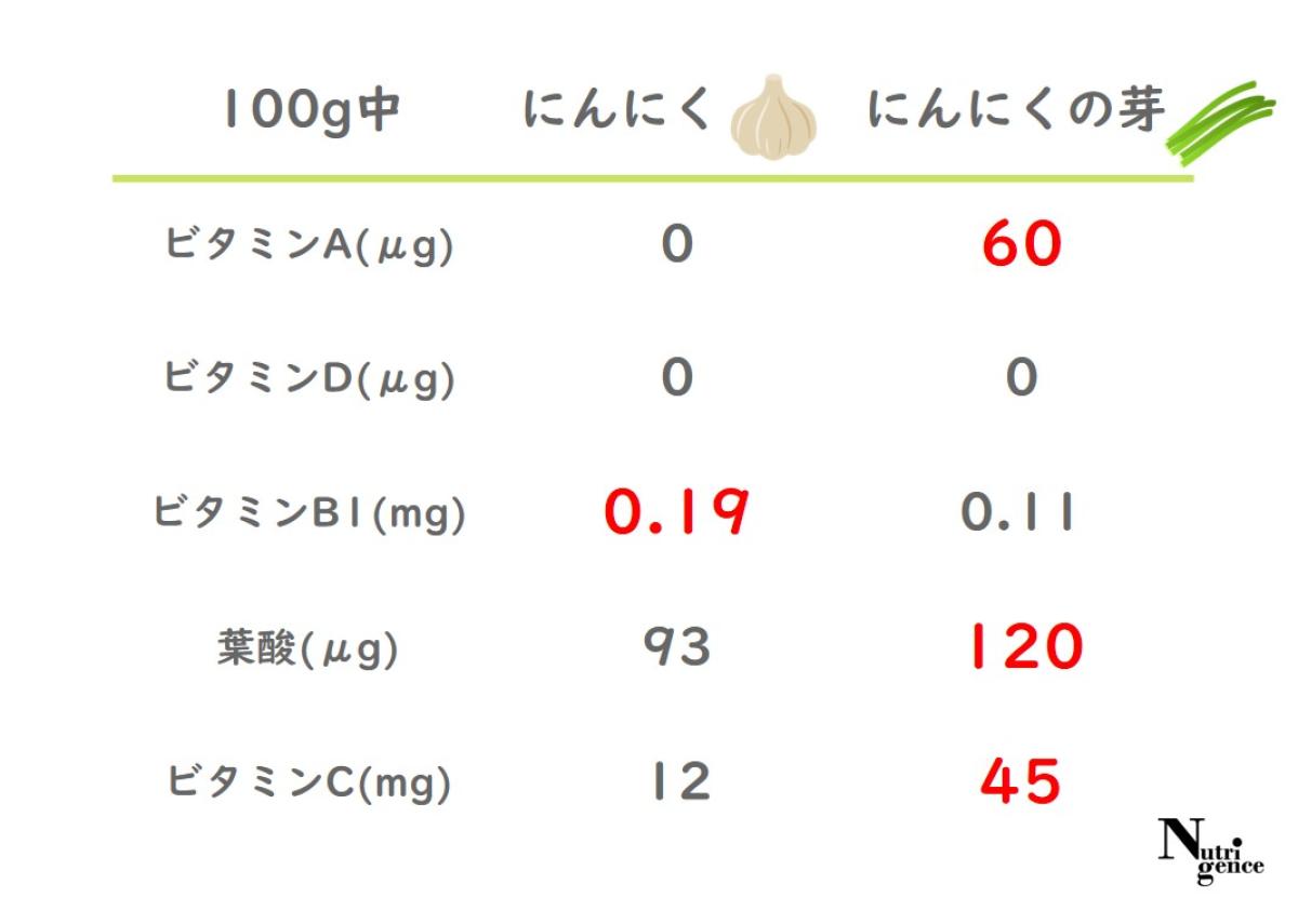 ビタミンB1(糖質をエネルギーに変換させる働きがある)はにんにくの方がにんにくの芽よりも多いようです。