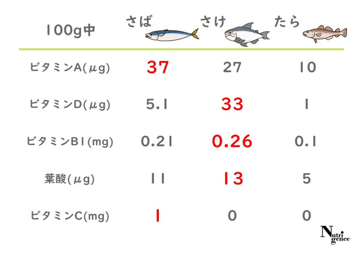 ビタミンC(活性酸素から守る役割やコラーゲン合成を助ける働きがある)は鯖・鮭・鱈にはほぼ含まれていないようです。
