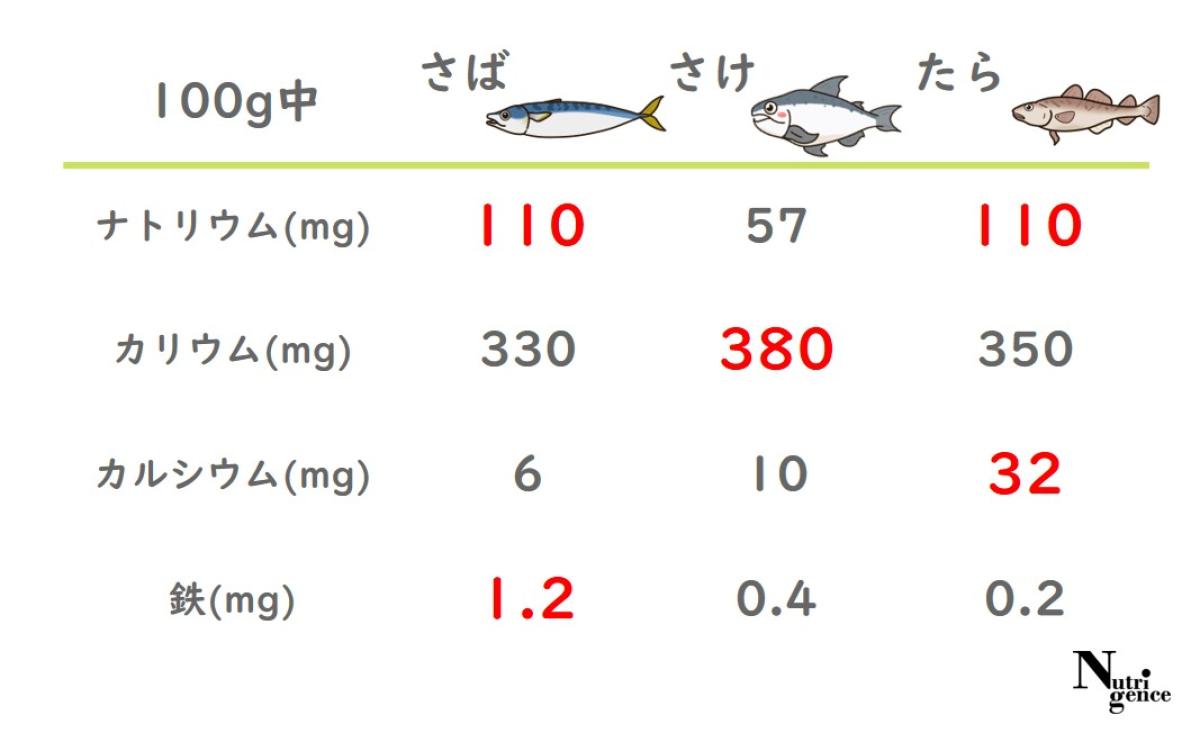 カリウム(体水分量を調節する役割や筋肉を収縮させる働きを持つ)は鮭、カルシウム(骨や歯の材料という役割や筋肉の動きを保つ働きがある)は鱈、鉄(赤血球の材料という役割を持つ)は鯖、にそれぞれ1番多く含まれているようです。