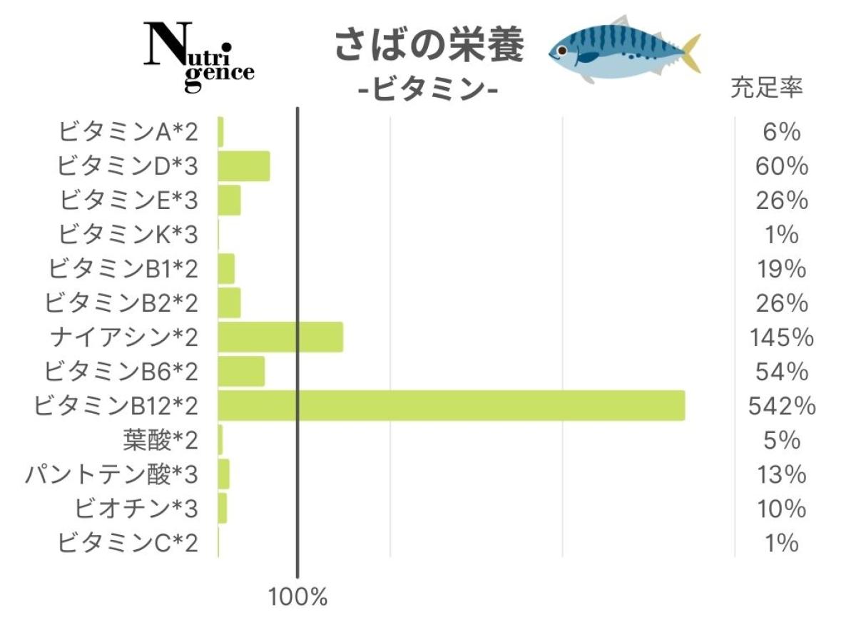 まさば100g食べた場合に20代女性が1日に必要な各栄養素をどの程度摂取できるかを示した割合。