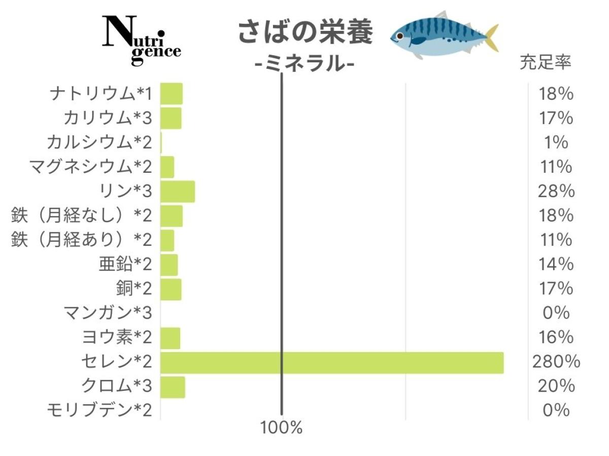 また20代女性がさば100gを食べた場合に1日に必要なビタミンやミネラルをどのぐらい摂取できるのかまとめてみました。