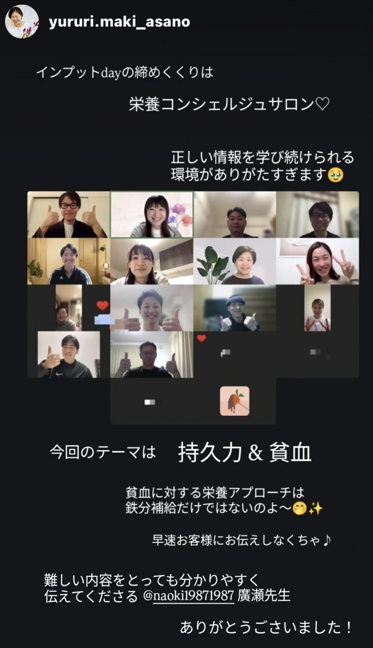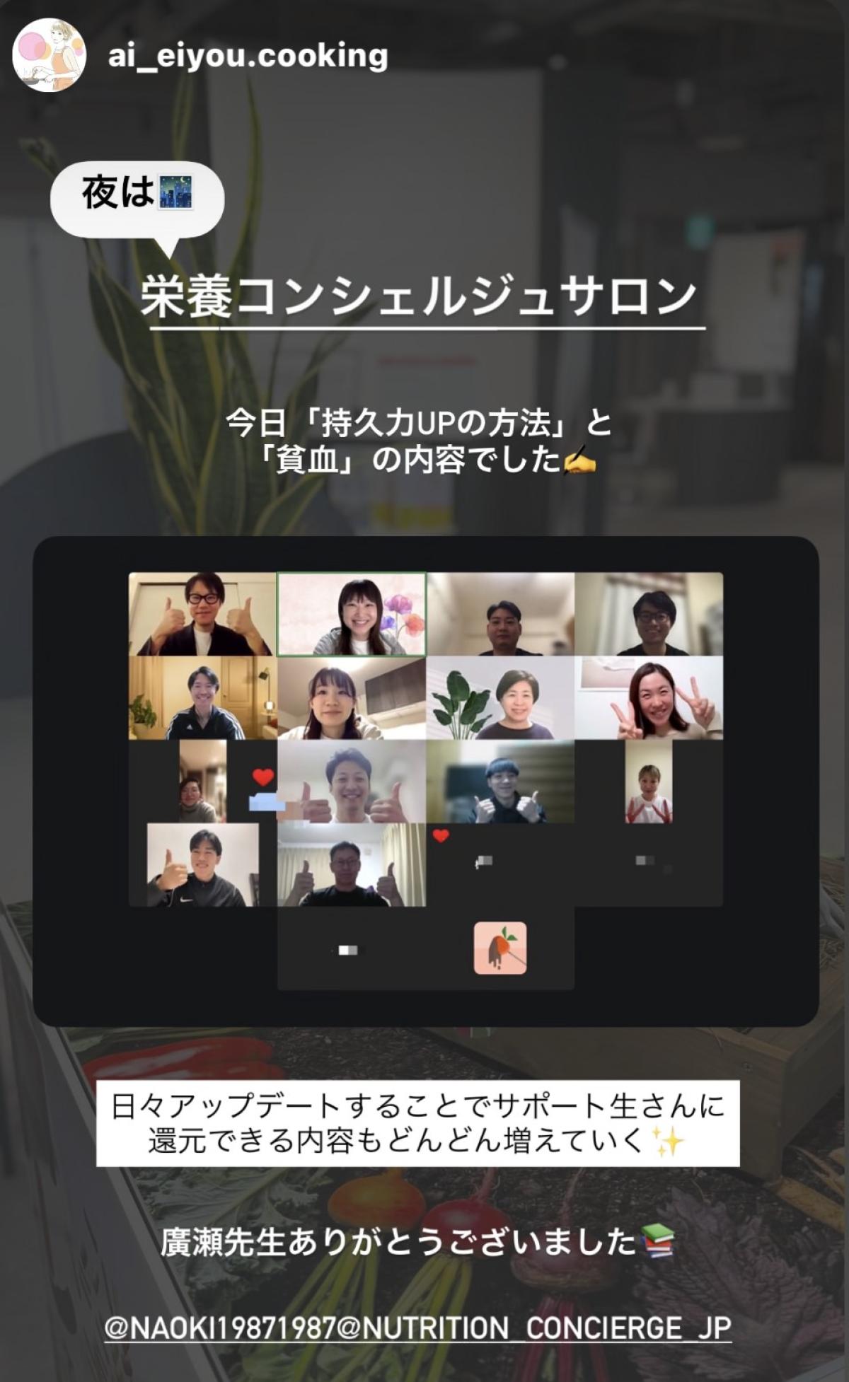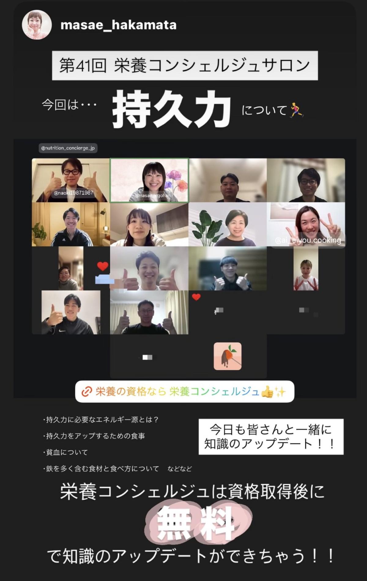 栄養コンシェルジュサロンは、「栄養コンシェルジュ®︎」の資格を取得された方限定で、毎月無料開催している知識アップデートの場(資格取得後のアフターサービスの一つ)です。